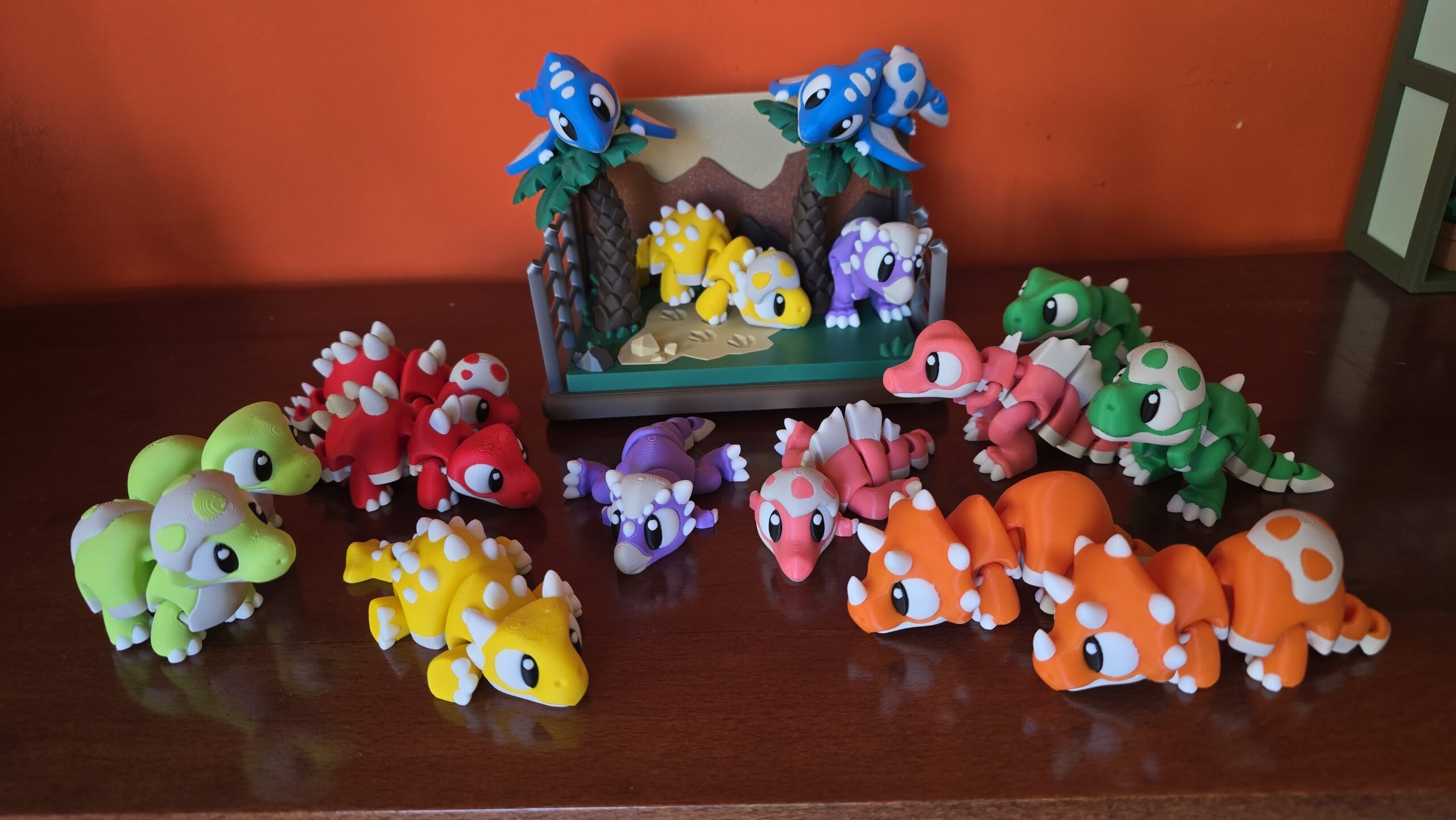 Adorables dinosaurios articulados impresos en 3D. Dos formas disponibles, con restos de huevo o sin huevo. También se puede adquirir un recinto. T-Rex, Triceratops, Pterodactilo, Stygimoloch, Ankilosaurio, Espinosaurio y Braquiosaurio. También disponibles en llavero