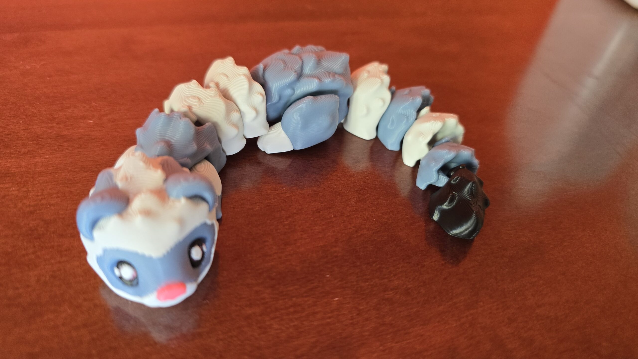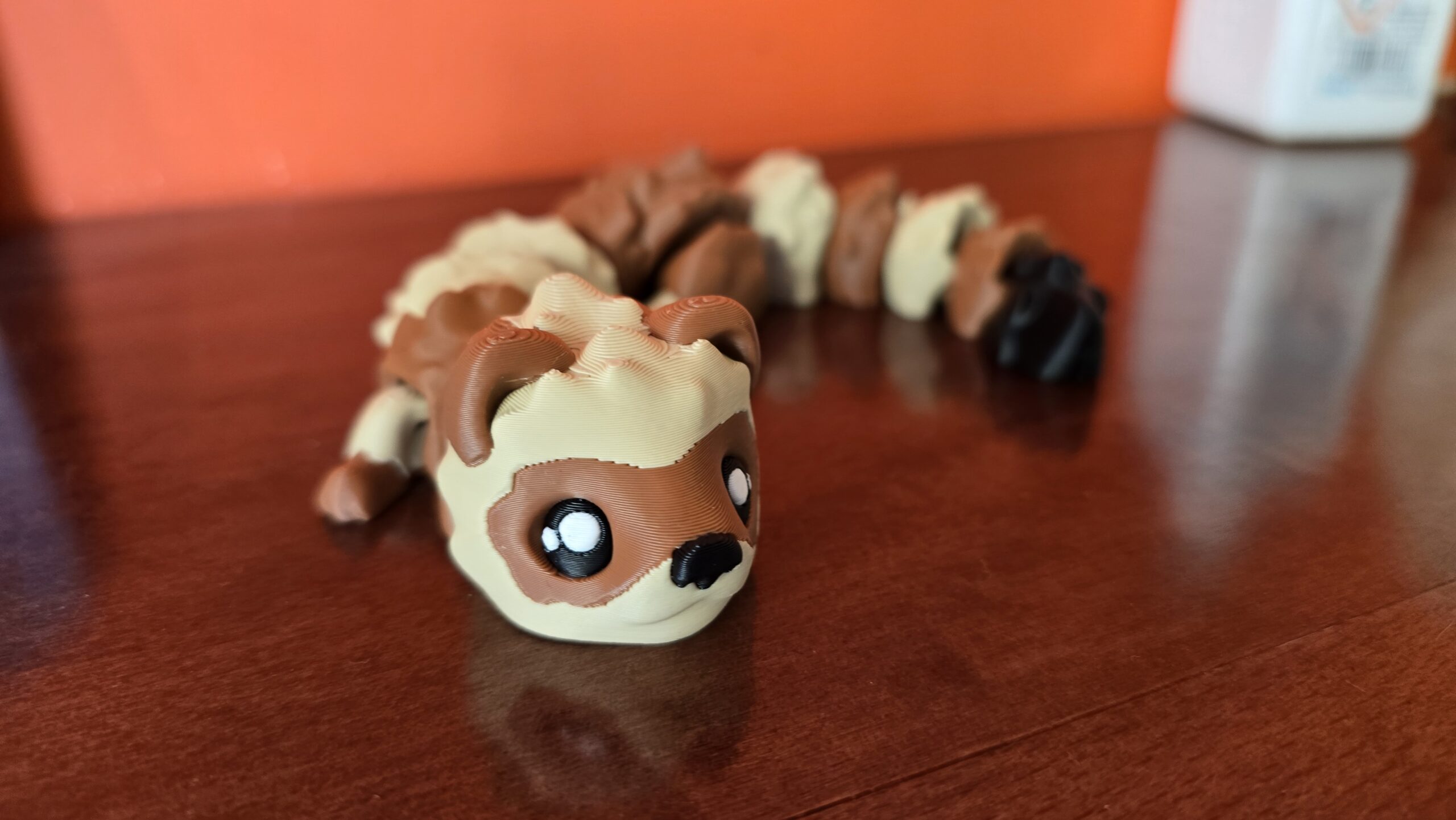 Hurón articulado y flexible en dos tamaños y colores impreso en 3D. Hurón grande tonos marrones mide aproximadamente 23 cm y el hurón pequeño tonos grises aproximadamente 16cm