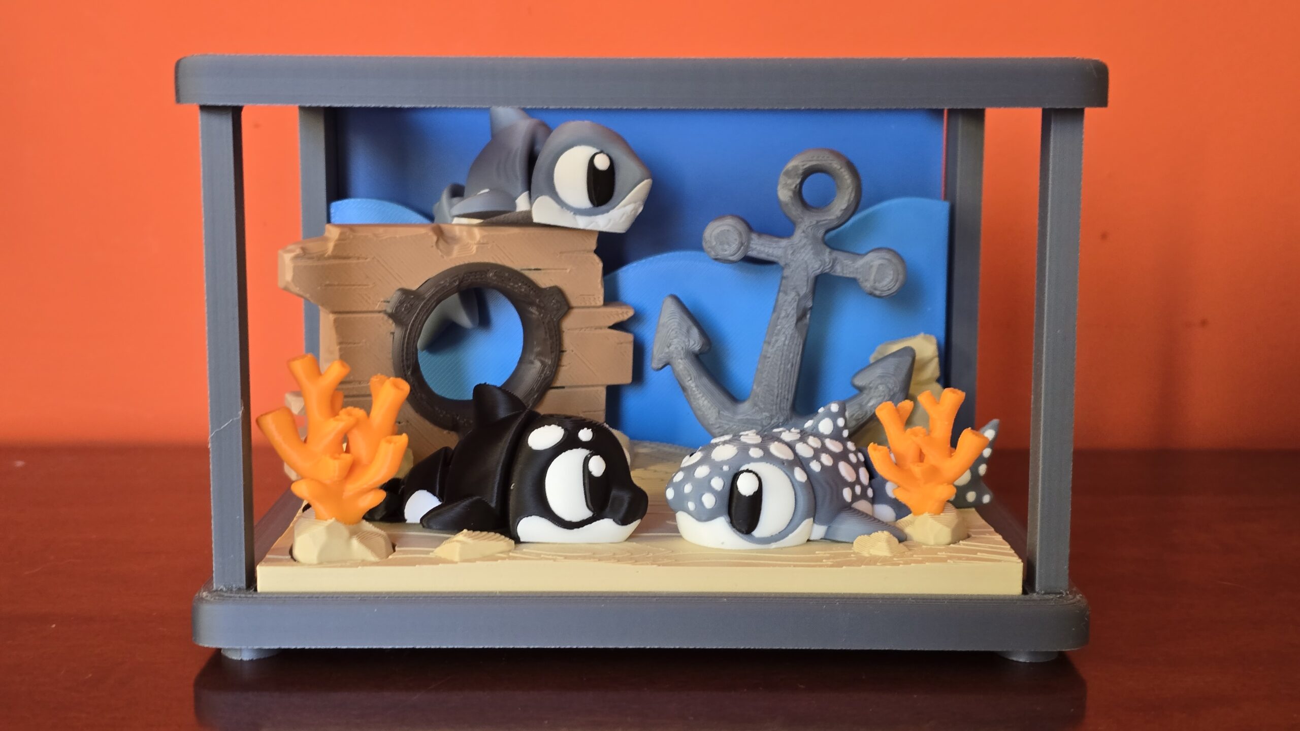 Adorables animales marinos articulados y flexibles; Orca, Tiburón y Tiburón Ballena. Con un diorama simulando el fondo marino. También en llavero